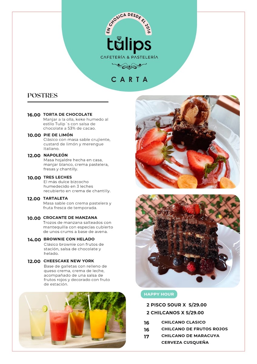 Welcome to Tulips, a charming café nestled in Lurigancho-Chosica, Peru, designed for every meal of the day. With its inviting ambiance and meticulous décor, Tulips excels in providing a warm space for breakfast, lunch, or a delightful dessert.